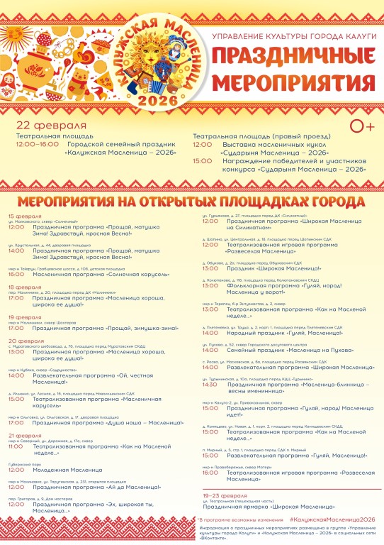 В управлении культуры Калуги опубликовали афишу городских мероприятий "Калужская Масленица - 2026".