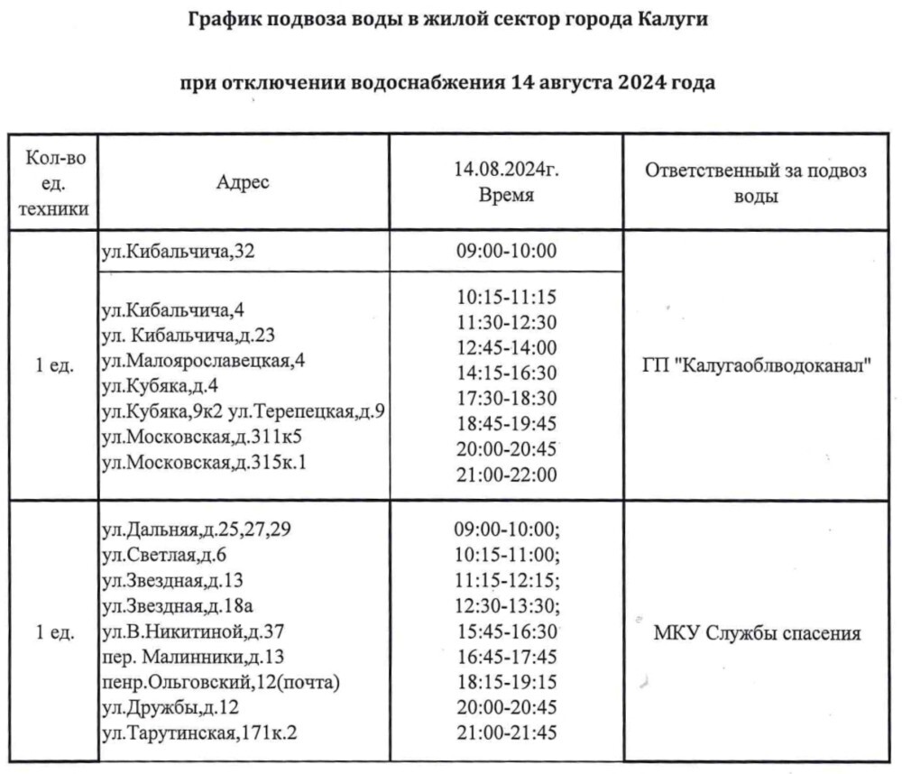 Адреса и время подвоза воды можно посмотреть в таблице ниже.