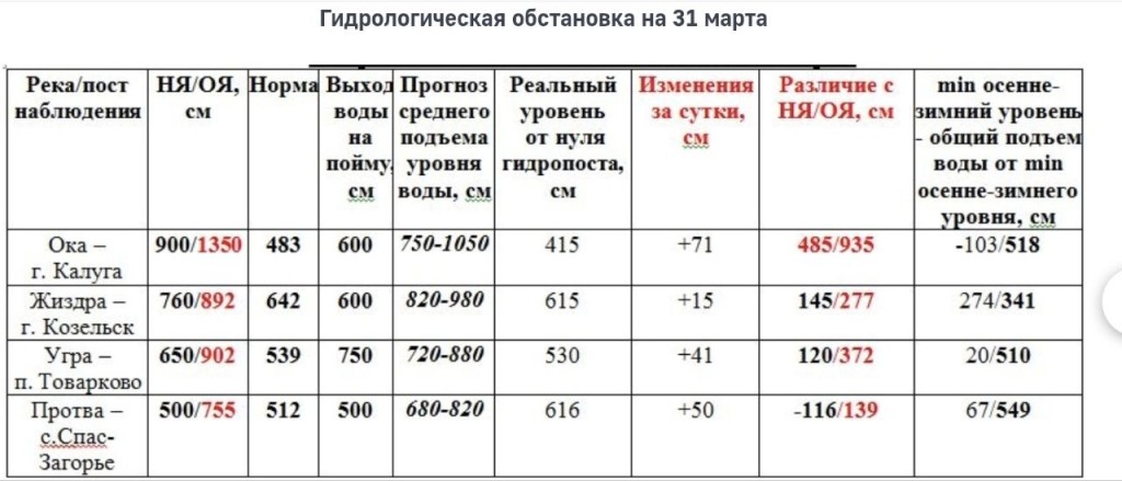 По данным на 31 марта, за последние сутки река Ока в Калуге поднялась на 71 см и достигла 415 см от нуля гидропоста, выход на пойму ожидается при 600 см. Угра в Товарково прибавила 41 см - до 530 см, выход на пойму произойдёт при 750 см. Протва в районе Спас-Загорья выросла ещё на 50 см - до 616 см, река уже вышла на пойму. Жиздра увеличилась на 15 см - до 615 см и тоже вышла на пойму.