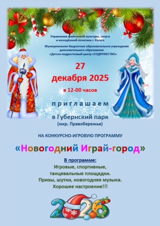 Как сообщили в управлении физической культуры, спорта и молодежной политики города Калуги, в Губернском парке проведут конкурсно-игровую программу "Новогодний Играй-город". Для гостей будут работать игровые, спортивные, танцевальные площадки. Гостей ждут конкурсы, призы, новогодняя музыка, шутки и отличное настроение.
