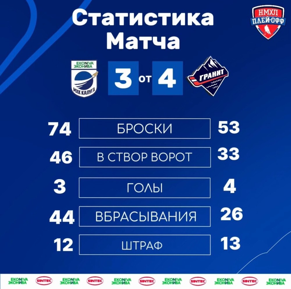 В последнем матче в первом периоде гости взяли преимущество и забили нашим парням 2 гола. Во втором - калужане отыграли один гол, но пропустили ещё один - 1:3. В третьем периоде калужане забили чеховцам 2 гола и сравняли счёт, но в овертайме "Гранит" взял перевес в 1 очко - игра окончилась со счётом 3:4 в пользу гостей.